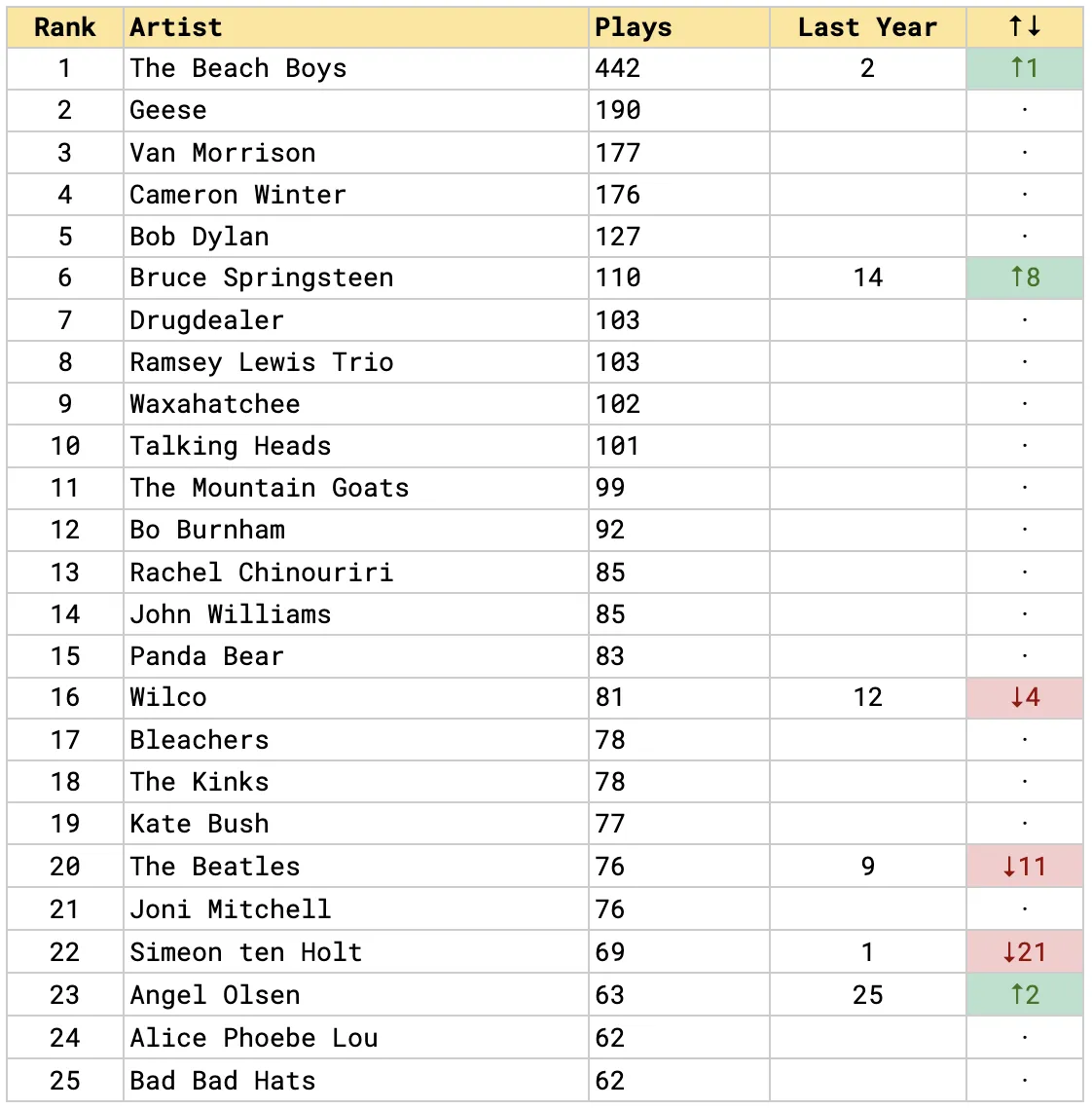 The Beach Boys reign supreme again. By my count, this the 4th time in 20 years they’ve been my most-played artist of the year. They really have a little bit of something for the whole family. Not even the combined zeitgeist of Cameron Winter + Geese could take them down.